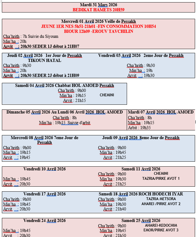 | Cha'hrith | Min'ha | Arvith | Min'ha veille | Cha'hrith | Min'ha |